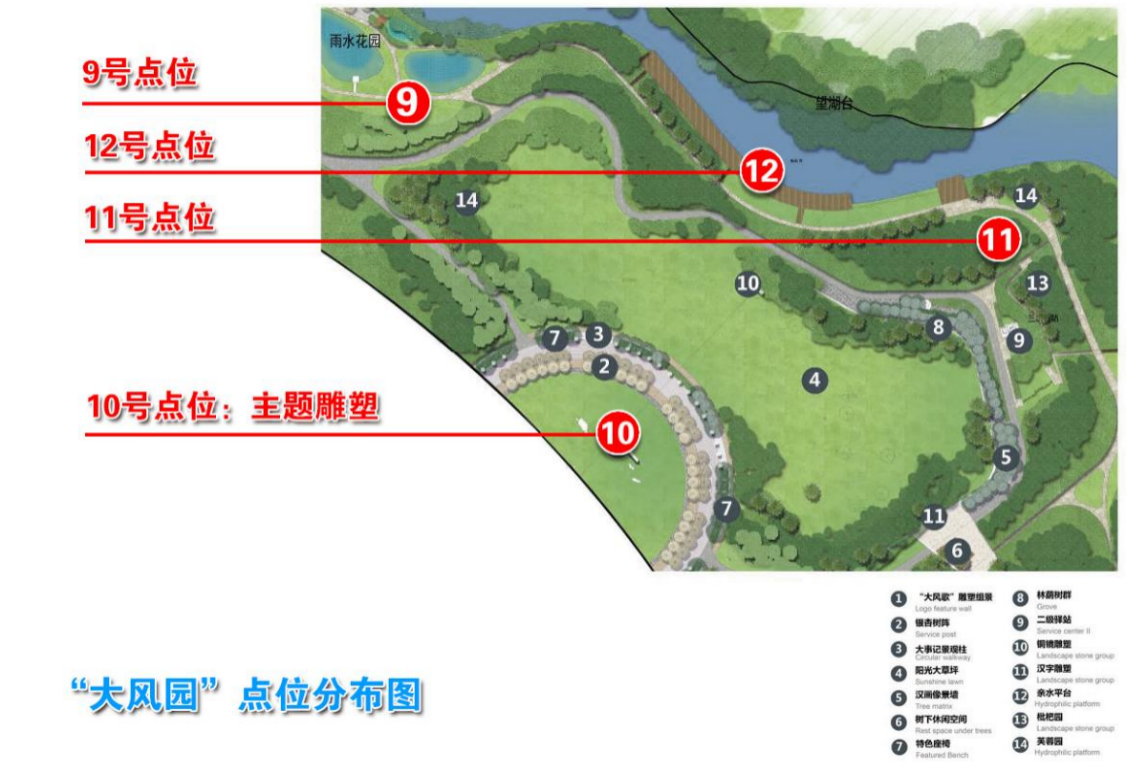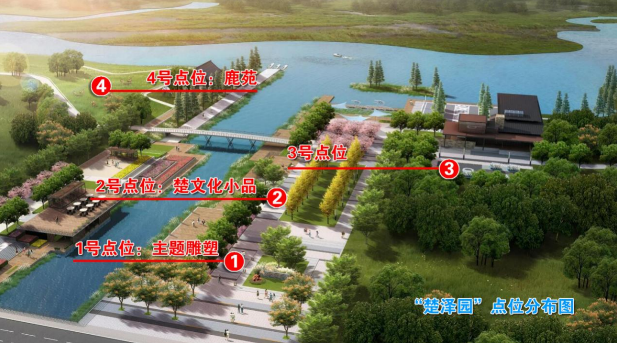 创作要点:展现深厚的楚汉文化、湿地文化底蕴,力求打造成为具有荆楚文化特色的滨水景观广场。其中2号点位雕塑的创作要点为:楚文化符号。4号点位创作要点为:鹿主题。