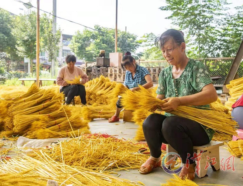 7月31日,襄州区程河镇张庄村村民制作金麦穗。金麦穗是装饰吉祥之物,市场需求量大。2017年,襄州区程河镇张庄村村民赵东军发现商机,创办金麦穗加工厂,精选小麦品种,夏季收割储存,在农闲时请村民制作。