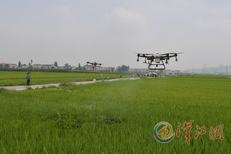 8月5日,在襄城区尹集乡聂营村,植保无人机在防治稻飞虱。当前,水稻、玉米已进入穗期,是产量形成的关键时期,同时也进入病虫害高发期。我市组织植保专业化服务组织,利用植保无人机等防治病虫害,保障粮食丰收。