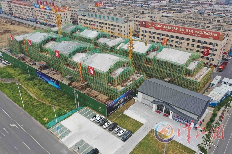 8月7日,无人机航拍的刚实现主体结构封顶的襄阳国际旅游茶城项目B区。