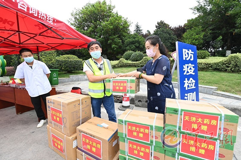 8月8日,襄阳天济大药房连锁有限公司将医用外科口罩、藿香正气口服液、金银花露、风油精、消毒液、毛巾等价值约2万元的防暑防护物资送到一线防疫点,用实际行动关心关怀奋战在疫情防控一线工作人员。