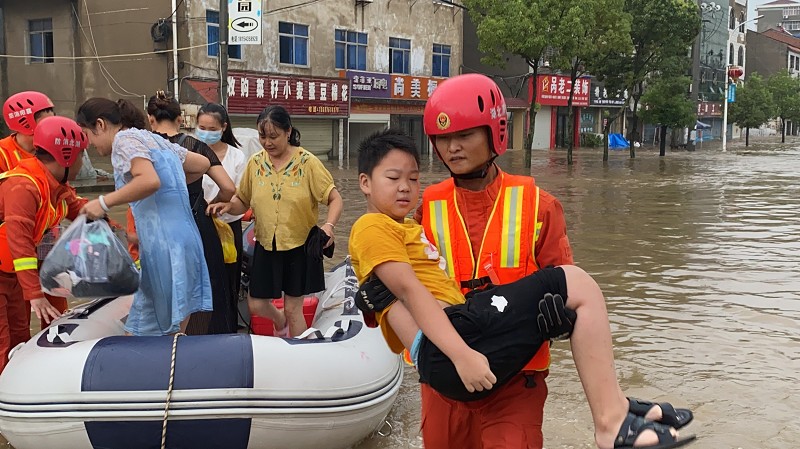 8月12日,南漳县消防救援队员利用橡皮艇转移被困群众。