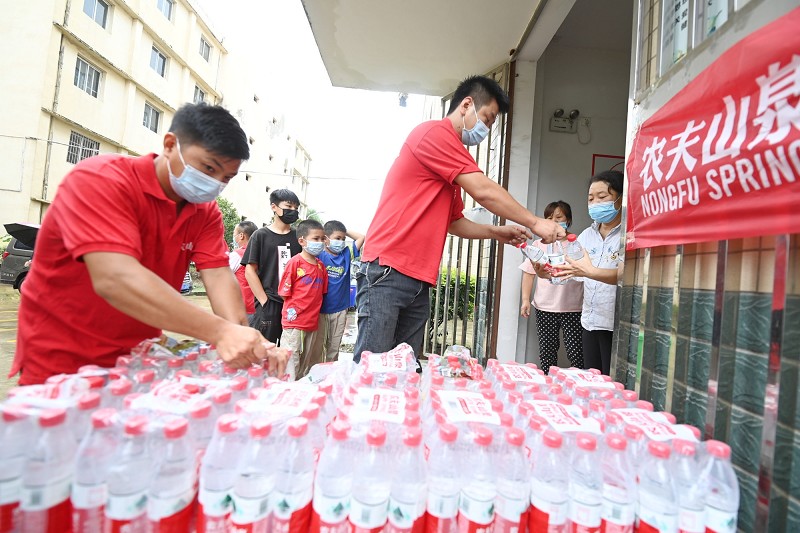 8月13日中午时分,志愿者为襄城区欧庙镇杨威中学安置点的受灾群众分发盒饭、矿泉水。