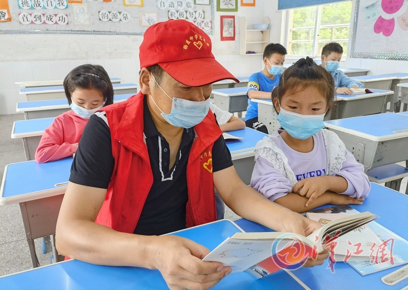 8月14日,在襄城区欧庙镇杨威中学安置点,志愿者陪伴孩子们读书、玩游戏。