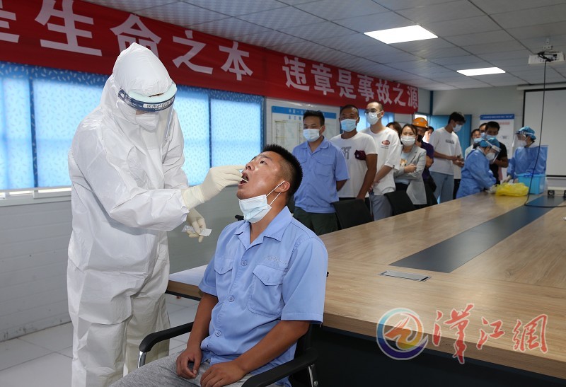 8月13日,在位于东津新区的中国一冶集团有限公司越秀项目现场,市中心医院医护人员为建设者们进行核酸检测。当日,中国一冶集团有限公司越秀项目全体管理人员、作业人员共计300多人完成核酸检测工作。