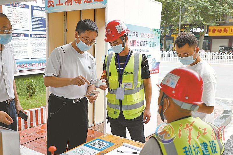 8月10日下午,在樊城区一建筑工地入口处,省利达建设工程集团工作人员正在给前来工地办事的人员测量体温,并检查健康码和行程码。