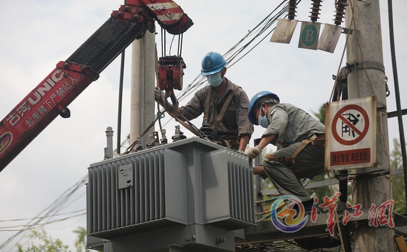 8月13日,谷城县供电公司电力工人,对10千伏盛艾联线三官庙3#台区进行增容改造,将200千伏安变压器升级为315千伏安,解决三官庙村疫情防控隔离点用电需求。通讯员 梁宗武 龙治江 全媒体记者 夏路 摄