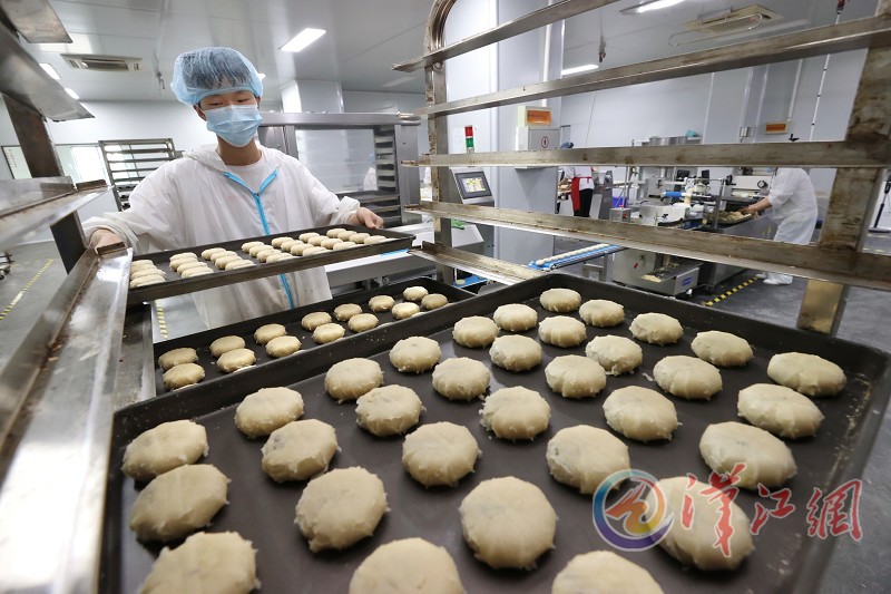8月17日,双沟工业园郭襄食品工业园,工人们在食品生产线生产苏式月饼。郭襄食品工厂于去年落户双沟工业园,主要生产休闲食品、传统中式糕点等产品。据该公司负责人介绍,公司目前为国内一些知名厂家代加工苏式月饼,虽然利润率低,但促进了当地群众就业。