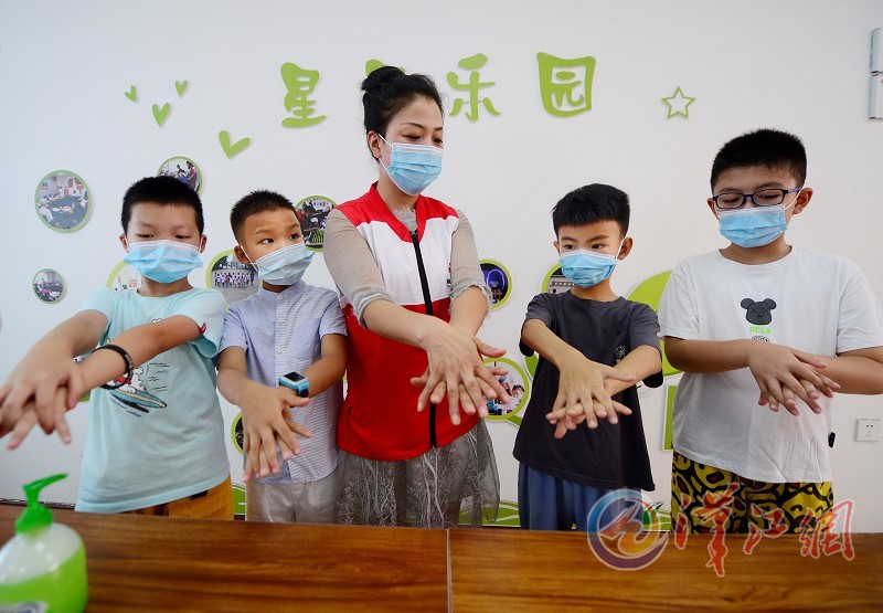 8月19日,在樊城区解放西路社区,志愿者们教孩子们学习日常防疫知识。当日,解放西路社区联合樊城区红十字心理援助志愿服务队开展“防疫课堂 丰富暑期”活动,教孩子们正确洗手及佩戴口罩,讲解日常防疫知识,帮助孩子们提高防范意识和能力。