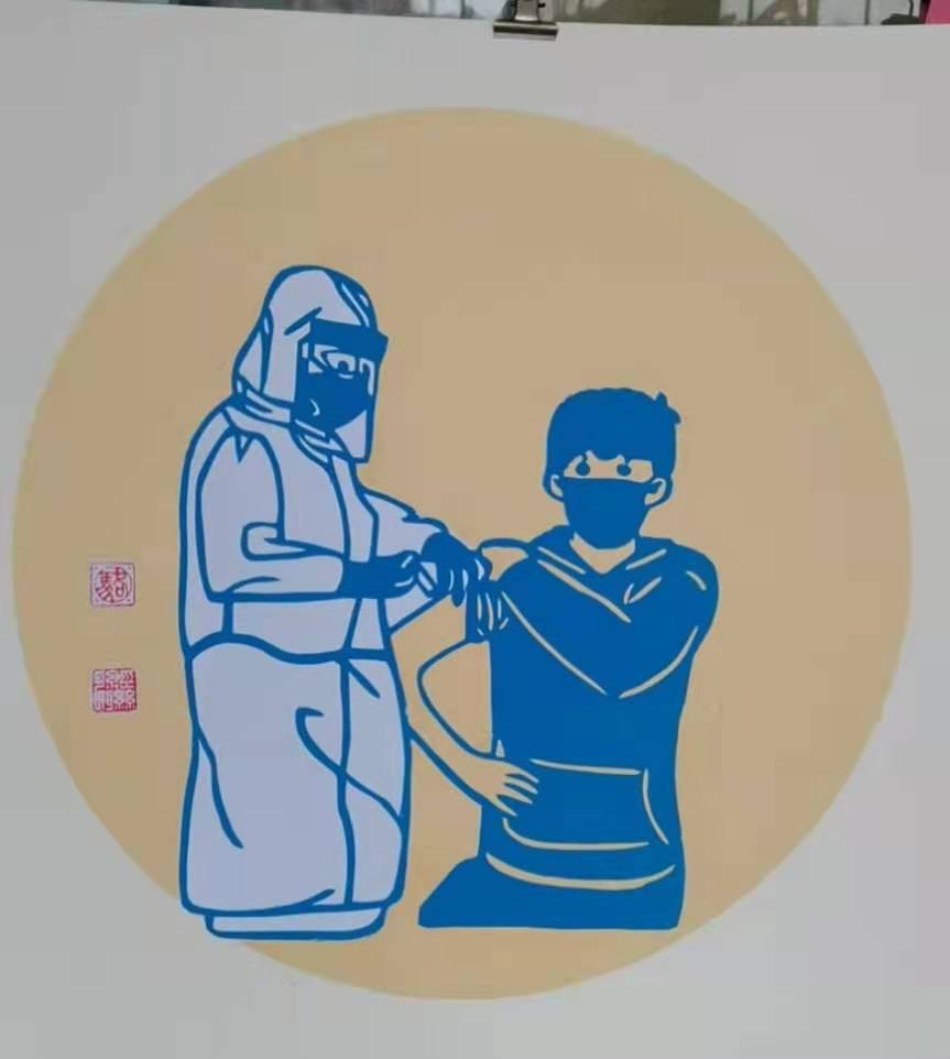 相比去年疫情期间创作的剪纸,今年的剪纸系列中,融入了一些新元素。“接种新冠疫苗是国家提出的常态化疫情防控重要手段。我们希望通过剪纸的形式,号召市民响应号召,积极接种。”朱德和说。