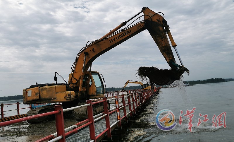 24日,两台挖掘机在中交二航局襄阳207国道牛首汉江特大桥施工现场清除杂草等漂浮物。受汉江流域降水、上游丹江口大坝开闸泄洪影响,汉江水位上涨,牛首汉江特大桥施工现场最高水位已达65.98米。