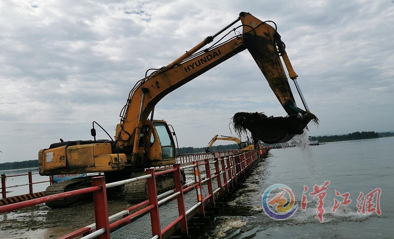 8月24日,两台挖掘机在中交二航局襄阳207国道牛首汉江特大桥施工现场清除杂草等漂浮物。
