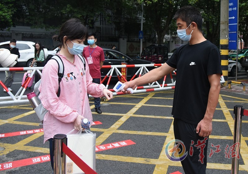 9月1日,襄阳一中学生在校门口间隔一米排队,测量体温入校。