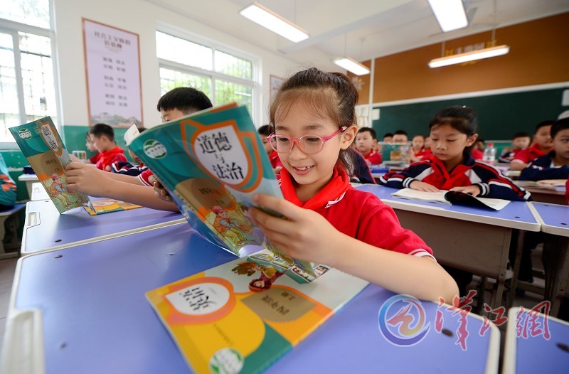 9月2日,人民路小学学生在教室领取新课本。当日,我市义务教育阶段学校正式开学。各学校在教育主管部门的组织下进行校园消杀、教材分发、后勤保障等工作,并开展多彩迎新生活动。