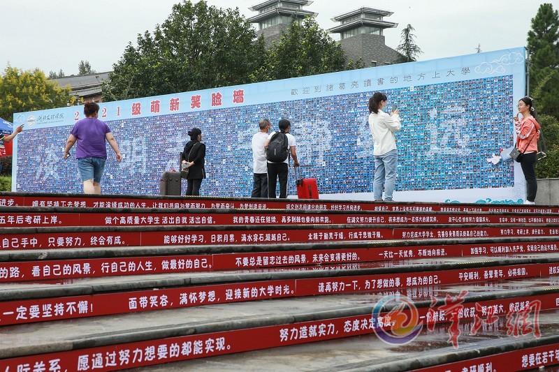 9月7日,湖北文理学院大一新生和家长查看“2021级萌新笑脸墙”。