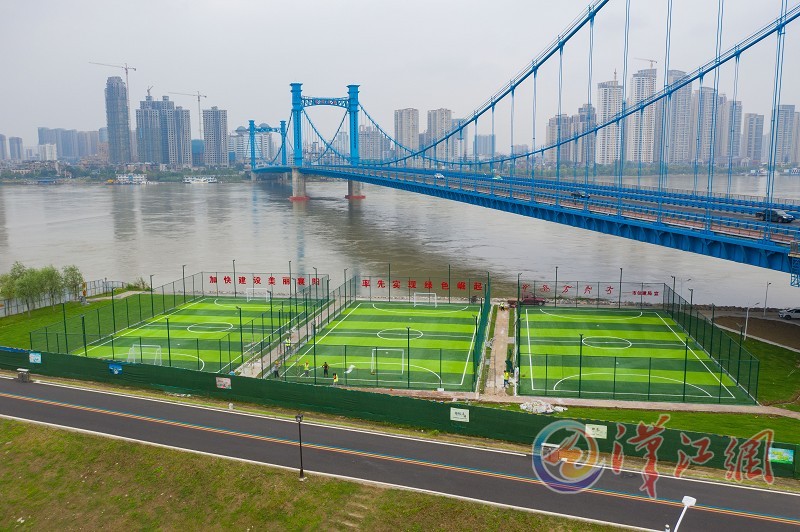 9月3日,襄阳凤雏大桥西侧新建的足球场正在收尾施工。此处曾是襄阳凤雏大桥施工平台,大桥主体完工后,为改善全民健身场地设施供给不足的状况,襄阳市政府投资工程建设管理中心将施工平台进行改造,增加景观绿化及相应配套设施,建设江边篮球场、足球场,使江堤成为居民的休闲打卡地。 全媒体记者杨东 通讯员陈鑫摄
