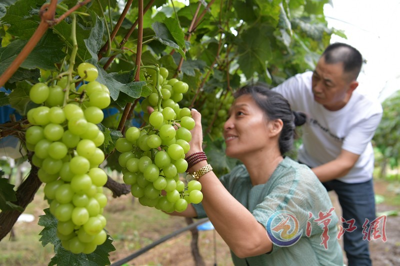 9月7日,游客在襄城区尹集乡肖冲村鲜乐家庭农场采摘葡萄。据农场主王健生介绍,他利用近郊优势,流转土地70亩,种植桑葚、葡萄、香梨、莲蓬等供游客采摘。近年来,襄城区因地制宜大力发展特色种养业,促进农业增效和农民增收,助力乡村振兴。 全媒体记者 安富斌 通讯员 黄杏平 王玲 摄