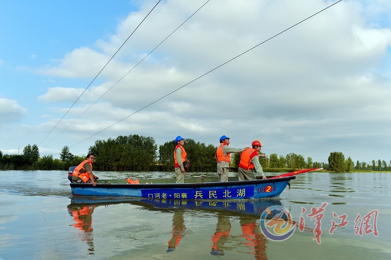 图为9月2日,在位于老河口市仙人渡镇崔营村的汉江泄洪区,老河口市供电公司党员服务队巡视跨越汉江的10千伏鹤55线崔营线路。