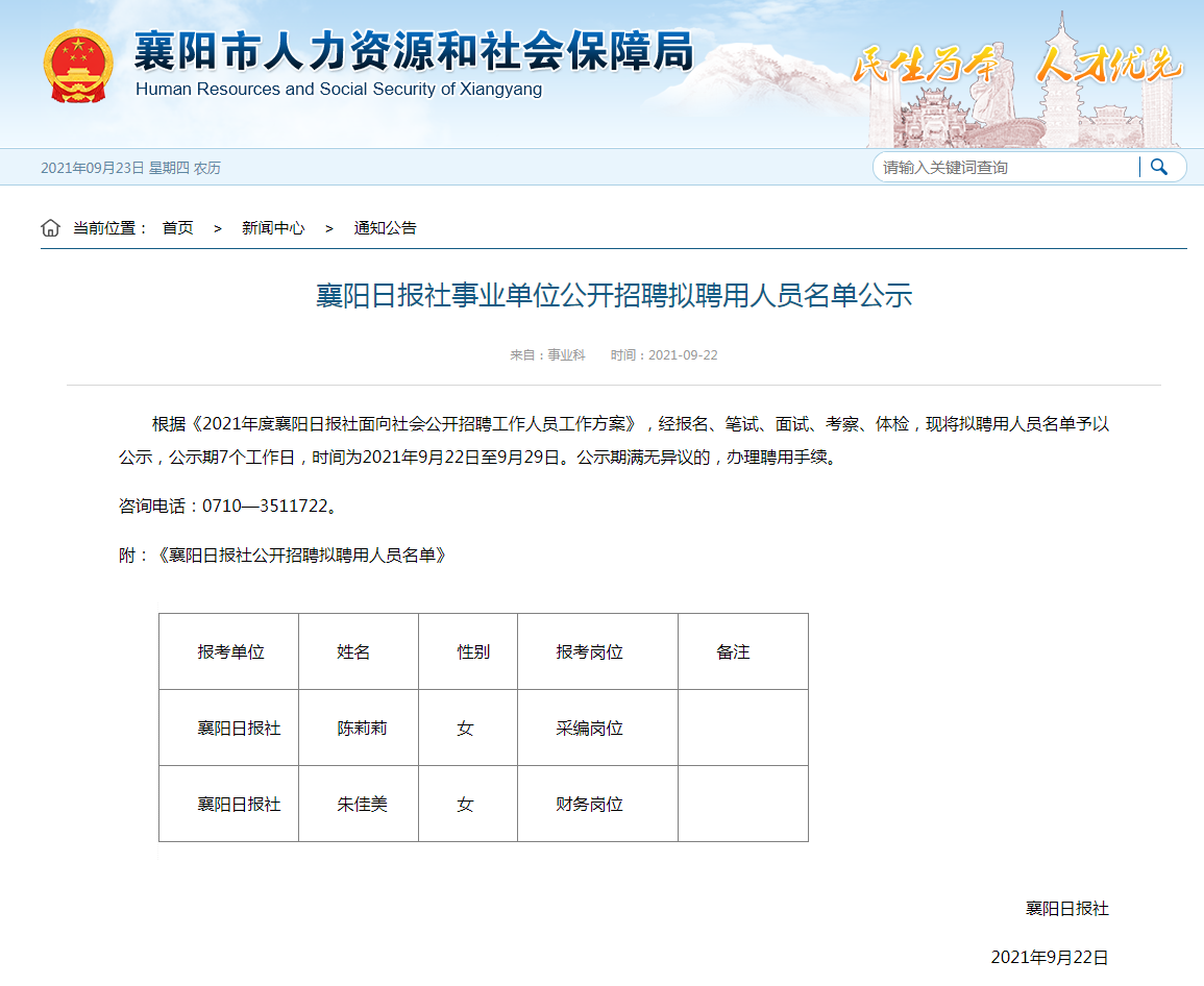 根据《2021年度襄阳日报社面向社会公开招聘工作人员工作方案》,经报名、笔试、面试、考察、体检,现将拟聘用人员名单予以公示,公示期7个工作日,时间为2021年9月22日至9月29日。公示期满无异议的,办理聘用手续。