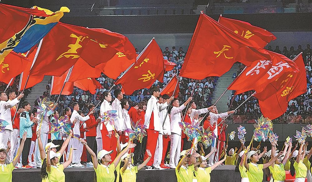 9月27日,执旗手在闭幕式上挥舞各体育代表团旗帜。 新华社 发