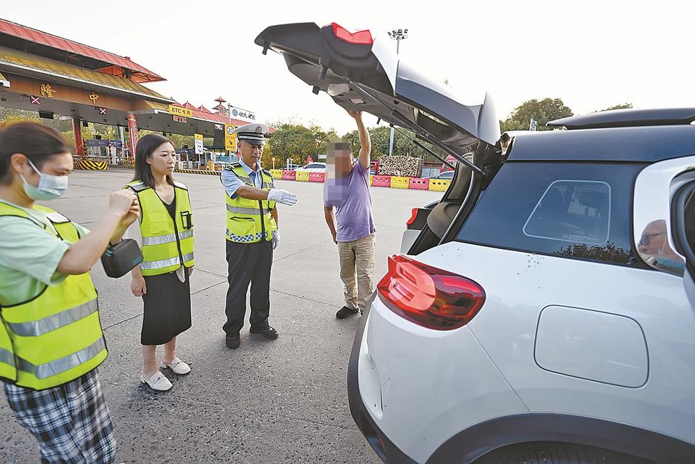 9月30日,纪检监察干部与民警在高速公路隆中收费站检查公车。