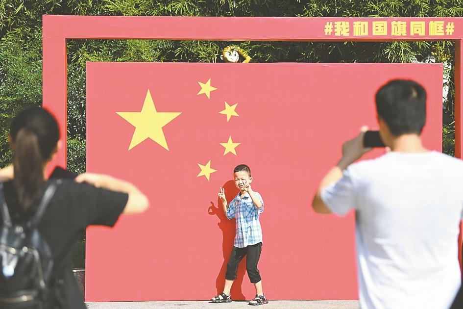 当日是国庆节,市民纷纷与国旗同框拍照,表达对祖国的祝福。