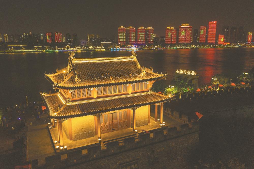 10月3日,汉江襄阳古城段两岸灯光璀璨,流光溢彩,吸引了众多游人。