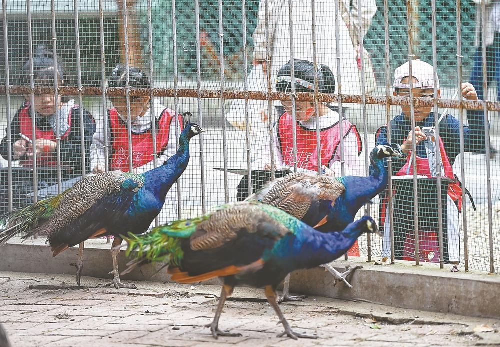10月5日下午,小朋友们在襄阳动物园为长颈鹿、孔雀等动物画像。