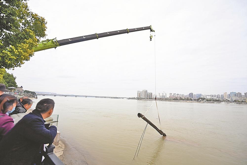 10月17日,在大北门附近,工作人员将汉江里的自来水取水口管头吊出进行改造。