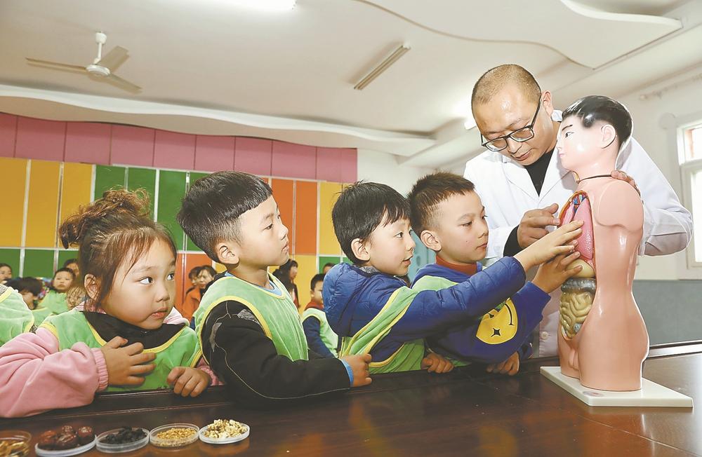 10月22日,襄阳市中医医院医护人员给襄阳市商务第二幼儿园的小朋友讲解人体穴位。当日是世界传统医药日,该幼儿园开展形式多样的中医药文化进校园活动,引导小朋友了解中医药文化。