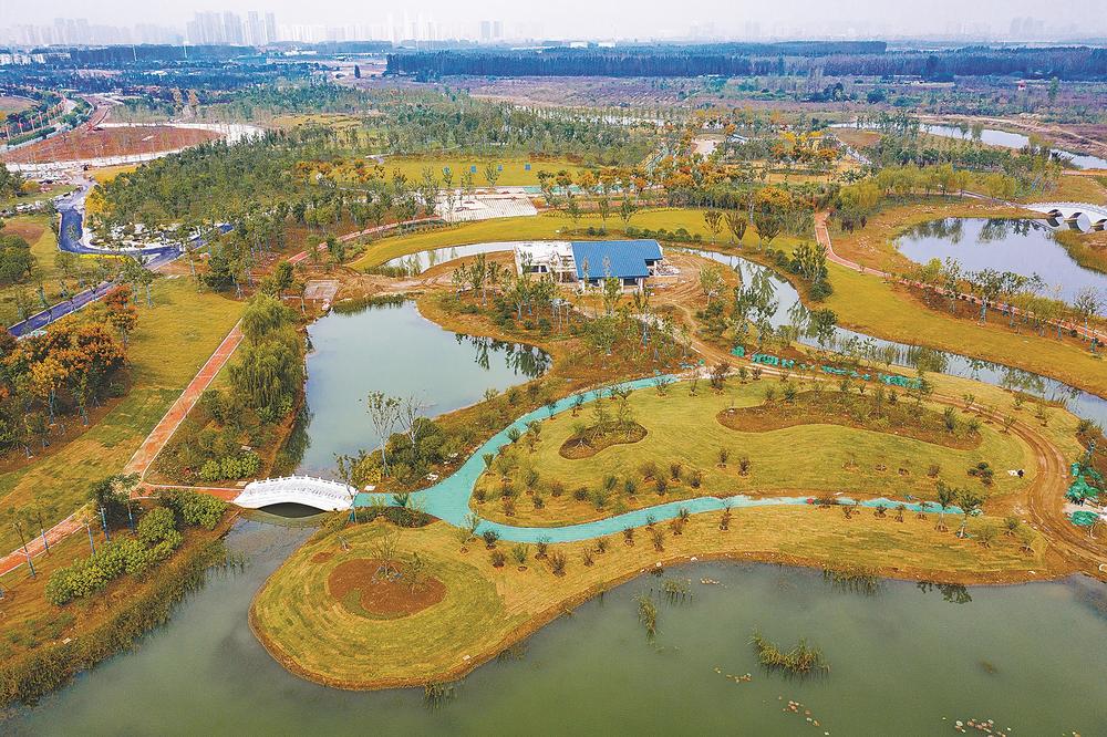 10月22日拍摄的正在建设的鱼梁洲中央生态公园一期汉水文化珠链区。