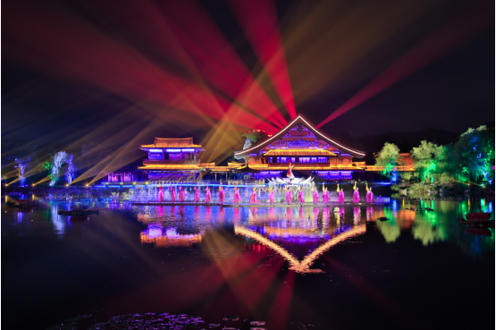 大型嵌入行进式夜游演艺项目《盛世唐城之大唐倚梦》,以“寻千年之恋、观盛世唐朝、展华夏雄风、乘复兴之梦”为主题,依托唐城独特的建筑美学,打造了夜游十景。巧妙的将具有40万平方米的国内最大仿唐建筑群,打造成为全景式舞台背景,将三大片区、五大主舞台与精彩演艺相互结合浑然一体。在节目编排上,打破常规演艺思维,颠覆传统表演形式,开放性线路多点式呈现出一幅大唐盛世的宏伟画卷。在科技方面,采用先进的声、光、电融合技术,打造亚洲最大墙体裸眼3D投影,营造出盛世唐城穿越之旅的不眠之夜。将游客带入盛世唐朝夜景之美的幻影里,让游客沉醉于莺歌战鼓沙场之美的盛唐梦境中。