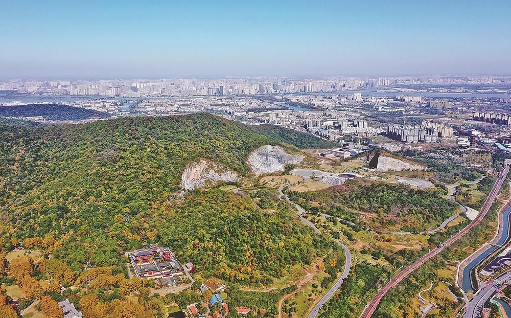 11月8日,无人机航拍的岘山矿山复绿的场景。岘山矿山复绿项目通过人文再造、生态重置,对占地1430 亩的山体进行大规模修复,项目占地1800余亩,投资5.5亿元,是目前全国最大的山体修复工程之一。