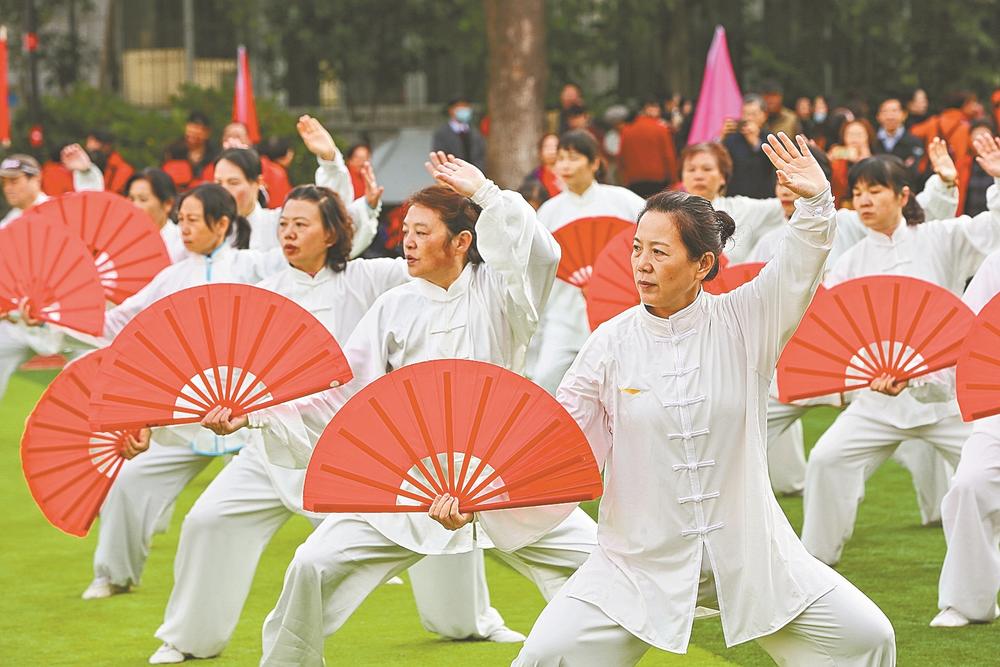 11月11日,在襄阳市老年大学运动会上,运动员们在进行团体太极扇展示。