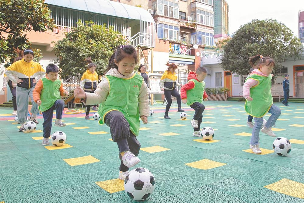 11月11日,在市直商务二幼,足球教练正在教小朋友足球基本功。据了解,市直商务二幼是全市首个足球特色幼儿园示范园,幼儿园以足球为载体,在寓教于乐中增强幼儿体质。