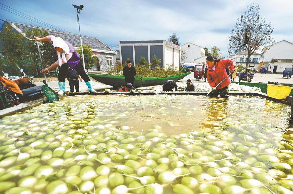 11月11日,农户在老河口王府洲供港果蔬基地清洗蔬菜。王府洲有晨光、八一、太山、甫洲四个村,近三分之一的村民世代以打鱼为生。汉江襄阳段实施“十年禁渔”后,王府洲渔民积极响应号召“洗脚”上岸,通过蔬菜种植、发展苗圃等,全部成功转产转业,从业人员平均月增收2000余元。