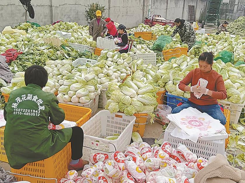 11月17日,在王集镇洪诚现代农业有限公司院内,村民们正在包装娃娃菜。眼下,王集镇主产的娃娃菜和甘蓝进入销售旺季,来自全国各地的经销商纷至沓来。全镇近3000名农民参与蔬菜销售全过程,人均收入在1.5万元左右。