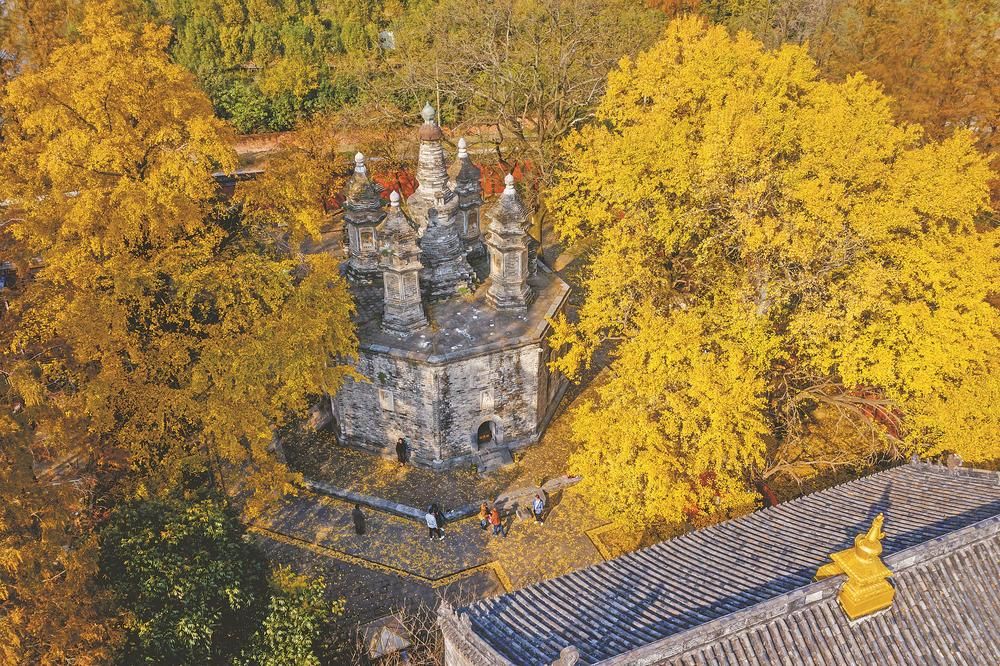 11月17日,位于襄城区广德寺内的古银杏树进入一年来最佳观赏期,金色的树叶在阳光照射下熠熠生辉。