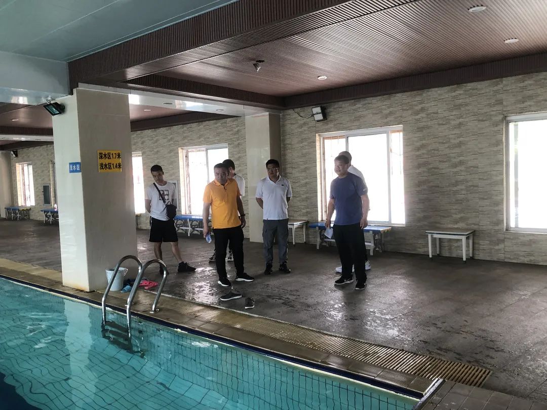 在恒温游泳馆,金鑫、王志刚等领导详细了解了泳池安全管理的工作机制、工作举措,并与负责人交流。