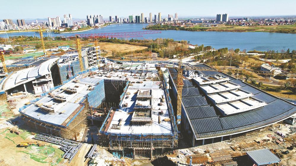 11月30日航拍的正在建设中的宜城市民生工程——“四馆两中心”。该市“四馆两中心”位于鲤鱼湖畔,占地80900平方米,总建筑面积约60050平方米,规划有图书馆、科技与规划展示馆、文化馆、工人文化宫和市民健身中心、妇女儿童文化中心。该项目总投资6.4亿元,计划明年完工。