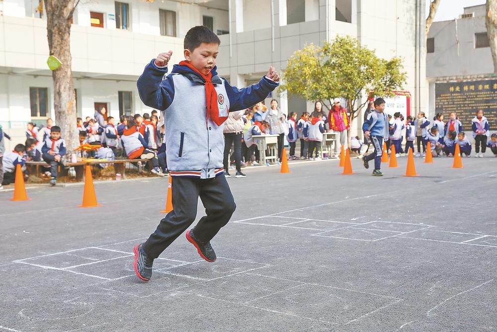智勇大闯关、足球点球大战、迎面接力……12月9日,昭明小学举办冬季趣味运动会,同学们用运动的方式庆祝母校118岁的生日。这是“双减”政策落地后该校首次举办运动会。本次趣味运动会以放松身心、愉悦生活为主旨,既充满了趣味性,又充满了挑战性。图为学生进行“跳房子”接力比赛。