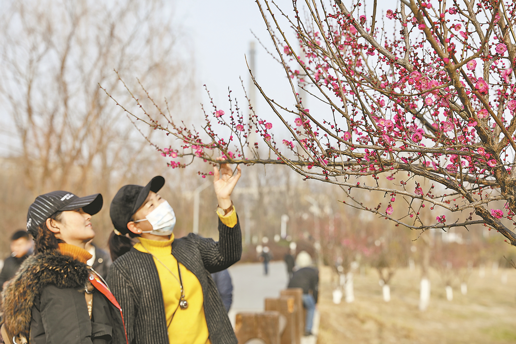 1月12日,市民在樊城区月亮湾公园观赏梅花。冬日时节,我市梅花相继绽放,成为一道亮丽风景线,吸引游客前来赏花拍照。