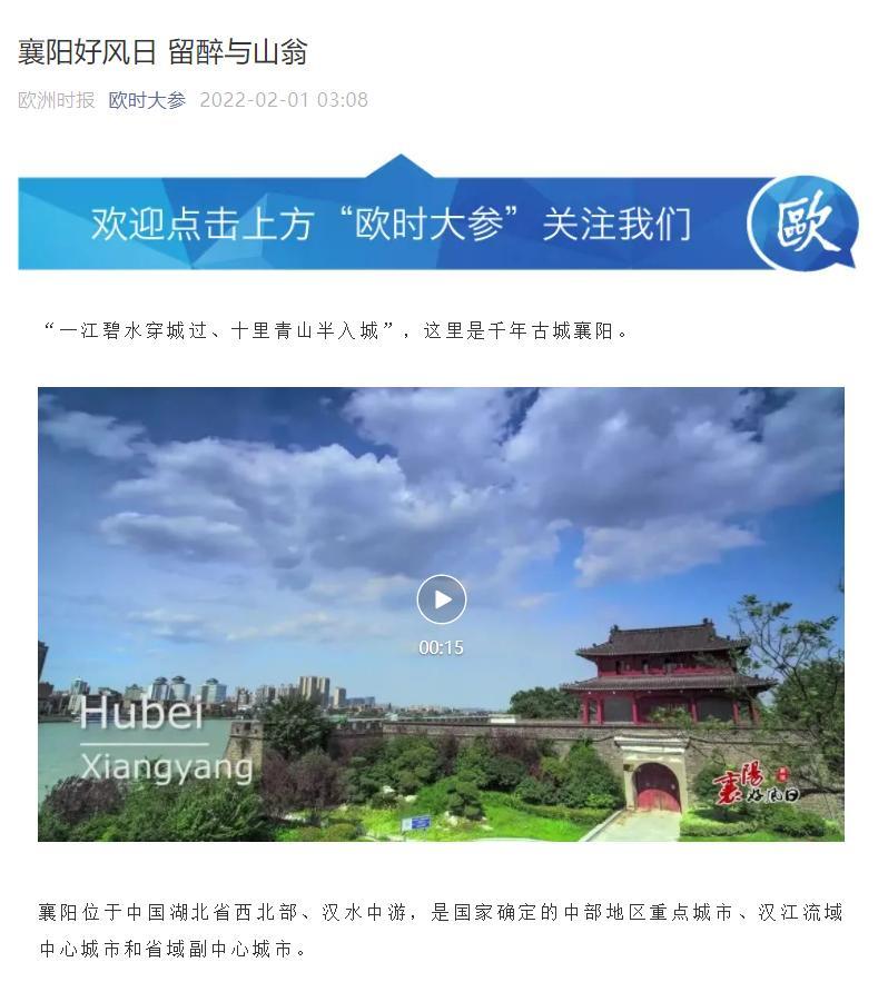 欧洲影响力最大的华文媒体《欧洲时报》官网及新媒体矩阵以《襄阳好风日 留醉与山翁》为题进行了隆重推介。欧洲时报新媒体矩阵包括“欧时大参”(法国)、英伦圈(英国)、维城(中东欧)、道德经(德国)、意烩(意大利),总粉丝量超百万,覆盖超30余个欧洲国家。
