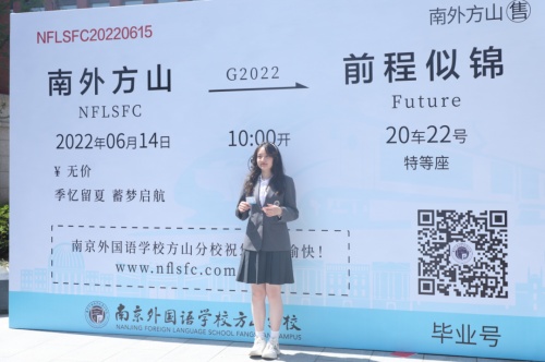 6月14日,南京外国语学校方山分校举行2022届高三毕业典礼暨成人仪式。从“南外方山”驶向“前程似锦”的G2022列车车票、写满“星河徜徉 一路有光”“保持热爱 奔赴山海”等祝福语的红毯,毕业礼物定制小熊……细节之中透露出学校对学子的满满祝福。(来源:南京外国语学校方山分校)