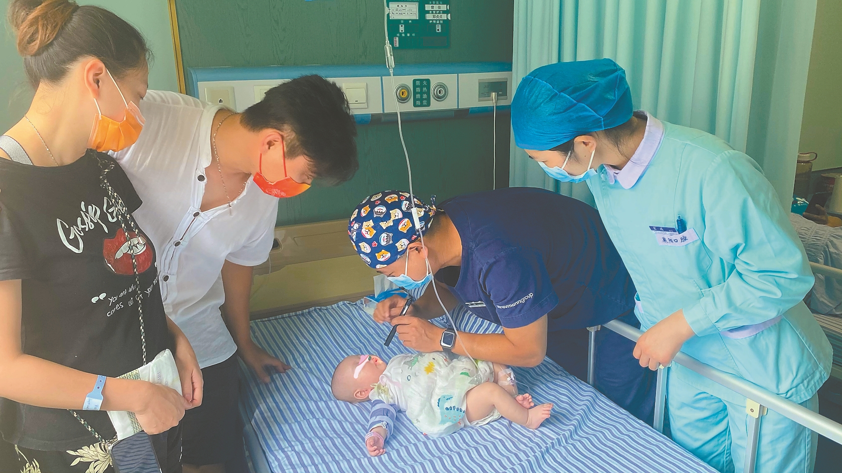曾佳医生(右二)正在查看患儿恢复情况 全媒体记者赵玲摄