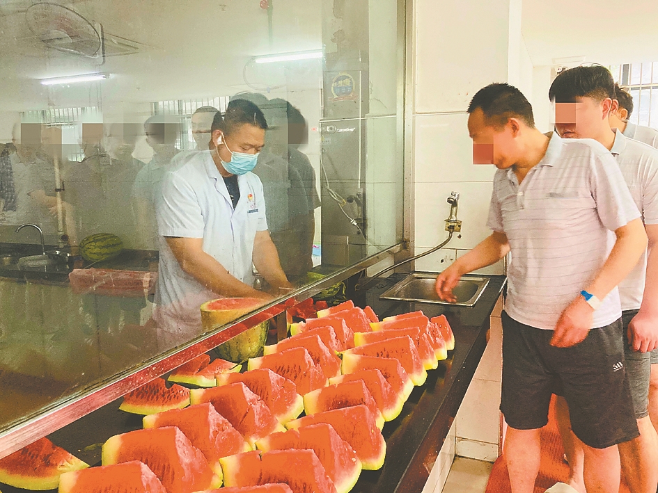 “进入7月份以来,襄阳气温较高,医院党委根据情况,要求我们分批采购西瓜,发放给患者,帮大家安心度夏。”膳食科主任曹明安介绍,为了保证西瓜的新鲜度,7月11日,膳食科工作人员不辞辛苦,顶着烈日,到宜城流水瓜地,采摘回6000斤西瓜。医护人员齐上阵,将西瓜清洗干净,分切成块,及时送到每位患者手中。