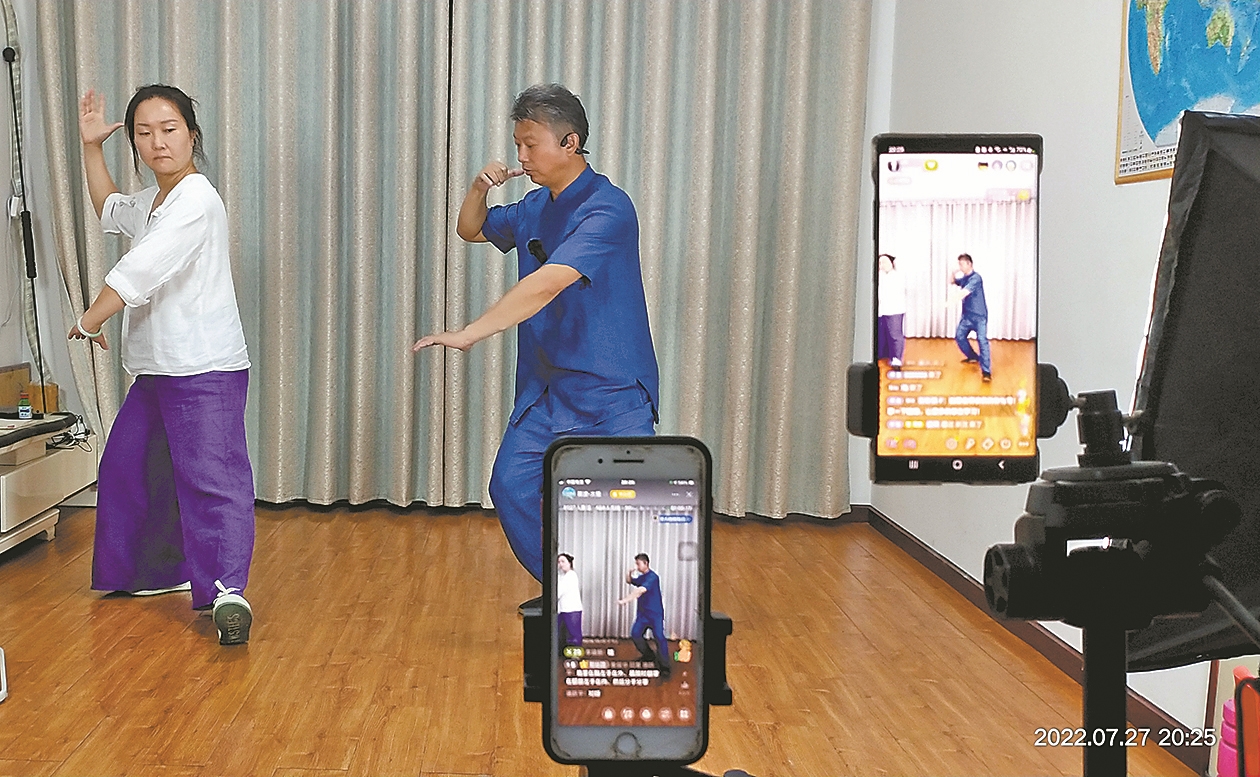 6月6日,陈波的太极拳教学课正式开播。经过两个多月的努力,直播间观看人次也从最初的600多人增至10000多人。“网络教学跟现场教学还有一定的区别,现场教学学员哪儿练得不对,我可以现场纠错。我便让网络学员把跟练视频发过来,每周四集中纠错。”陈波说,如今他的太极拳直播课每周四场,周一、周三晚上7点半讲太极拳套路和理论,周四集中纠错,周六上午8点半直播太极推手。