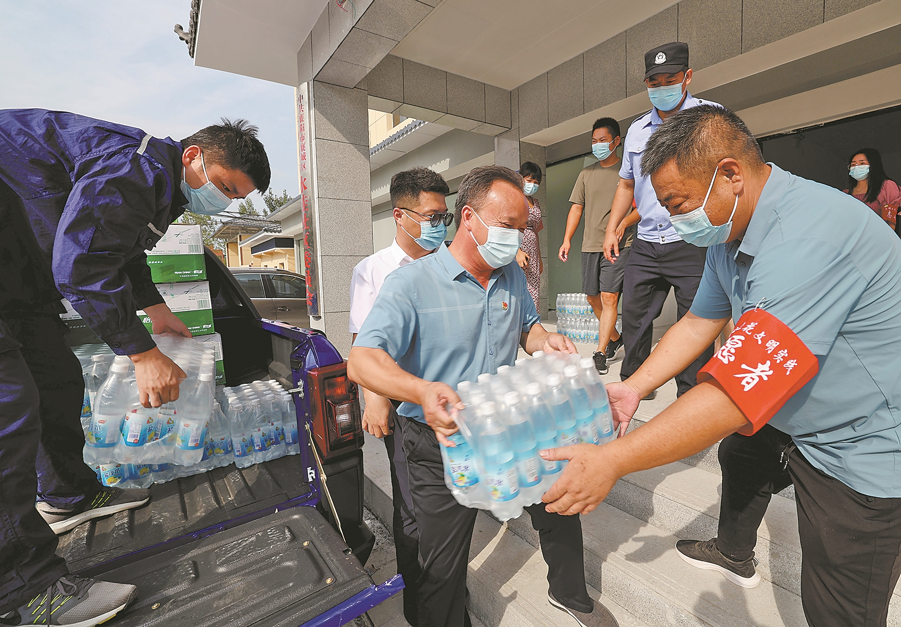 8月25日,襄阳恩菲环保能源有限公司工作人员向襄城区余家湖街道水洼社区志愿者送去防暑降温物品。