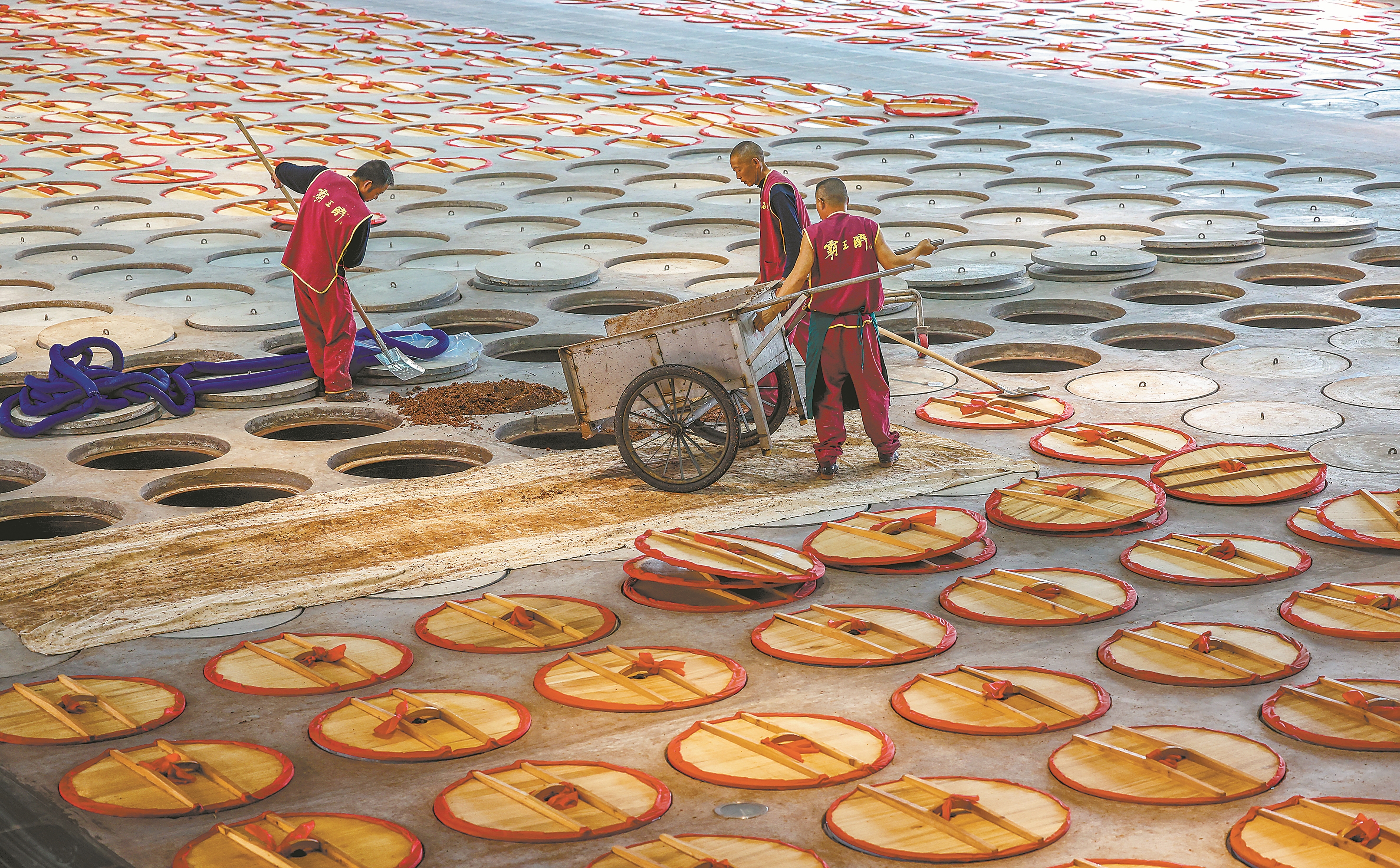 10月19日,酿酒工人在石花酒业霸王醉非遗传承酿造车间忙碌。近日,石花酿酒股份有限公司进入酿酒繁忙期,企业员工按照非遗酿造技艺生产白酒,浓郁的酒香在厂区飘散。据了解,石花酒传统酿造技艺是省级非遗项目,在石花酒业已延续数百年,培养出一大批酿酒匠人。