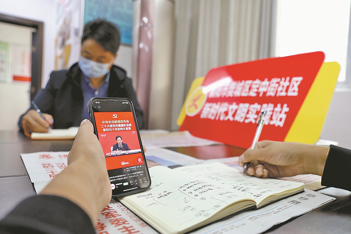 10月24日,樊城区定中街社区组织辖区党员、居民、志愿者,采取线上线下相结合的方式,通过读报、登录“学习强国”平台等,认真学习党的二十大精神。